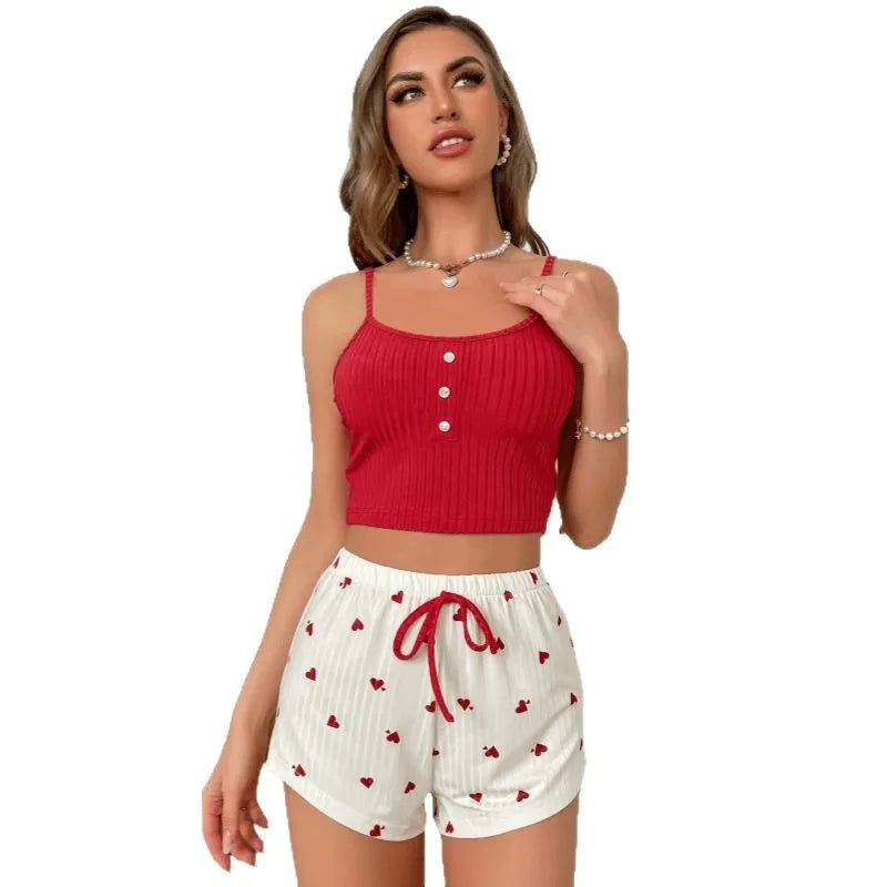 Pajamas 2 Piece Sets Women Camisole Shorts Suit Loungewear Heart Print Short Pants Sleeveless Sleepwear Summer Sweet Outfits